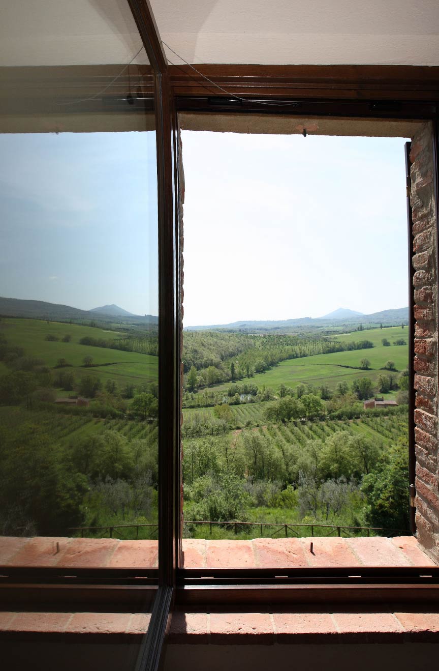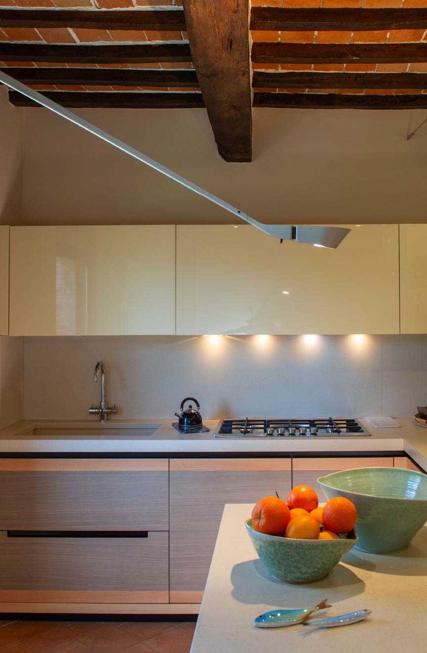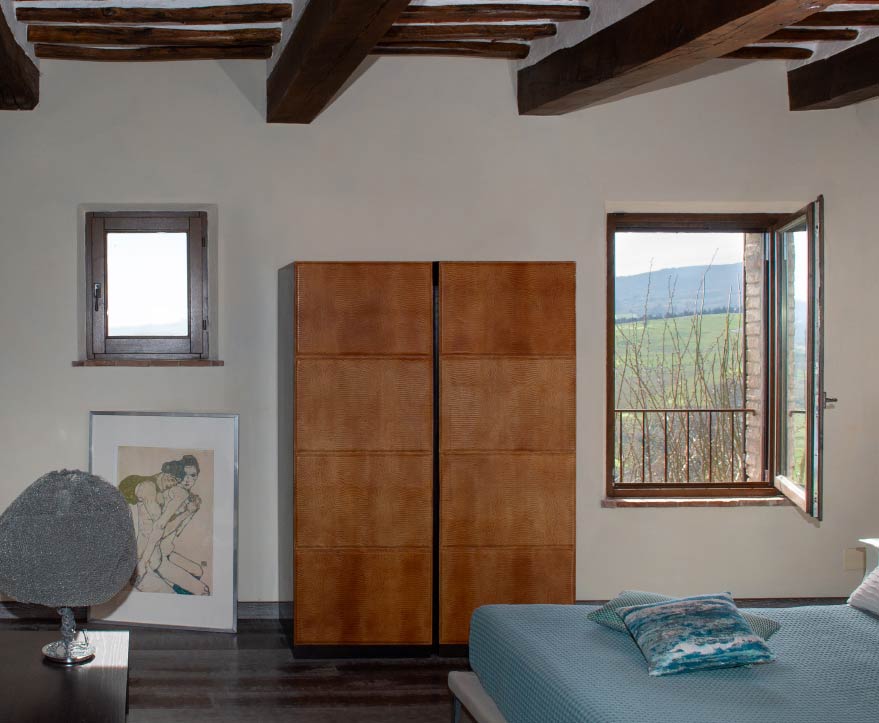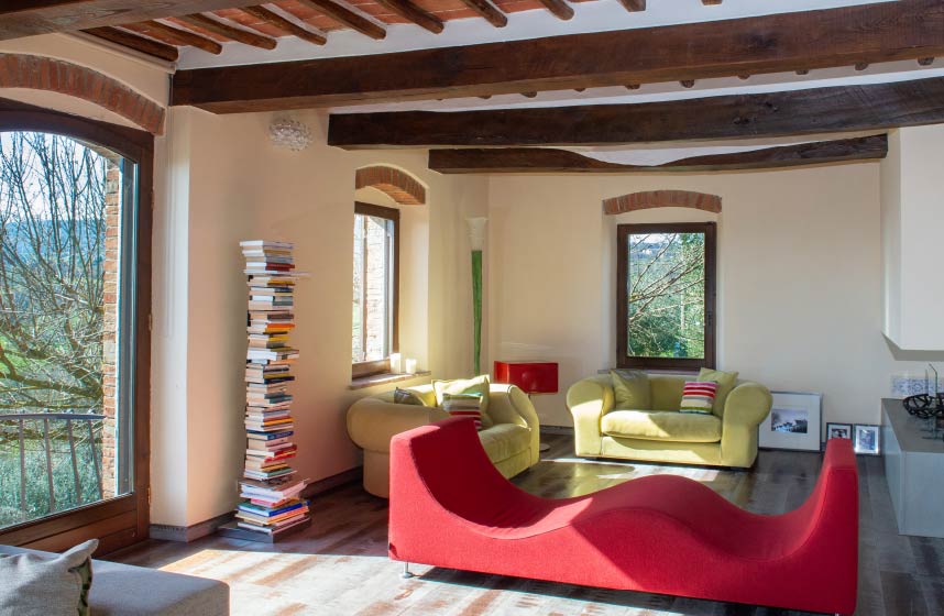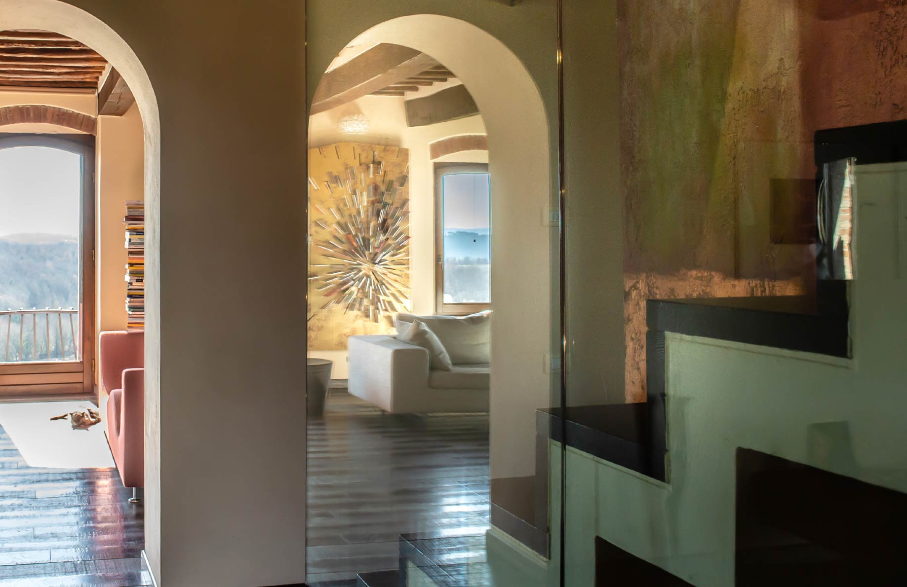 La rigorosa forma del casale originario trova equilibrio nella contemporaneità degli interni, valorizzati da giochi di trasparenze, colori e arredi iconici combinati con soluzioni progettate su misura.