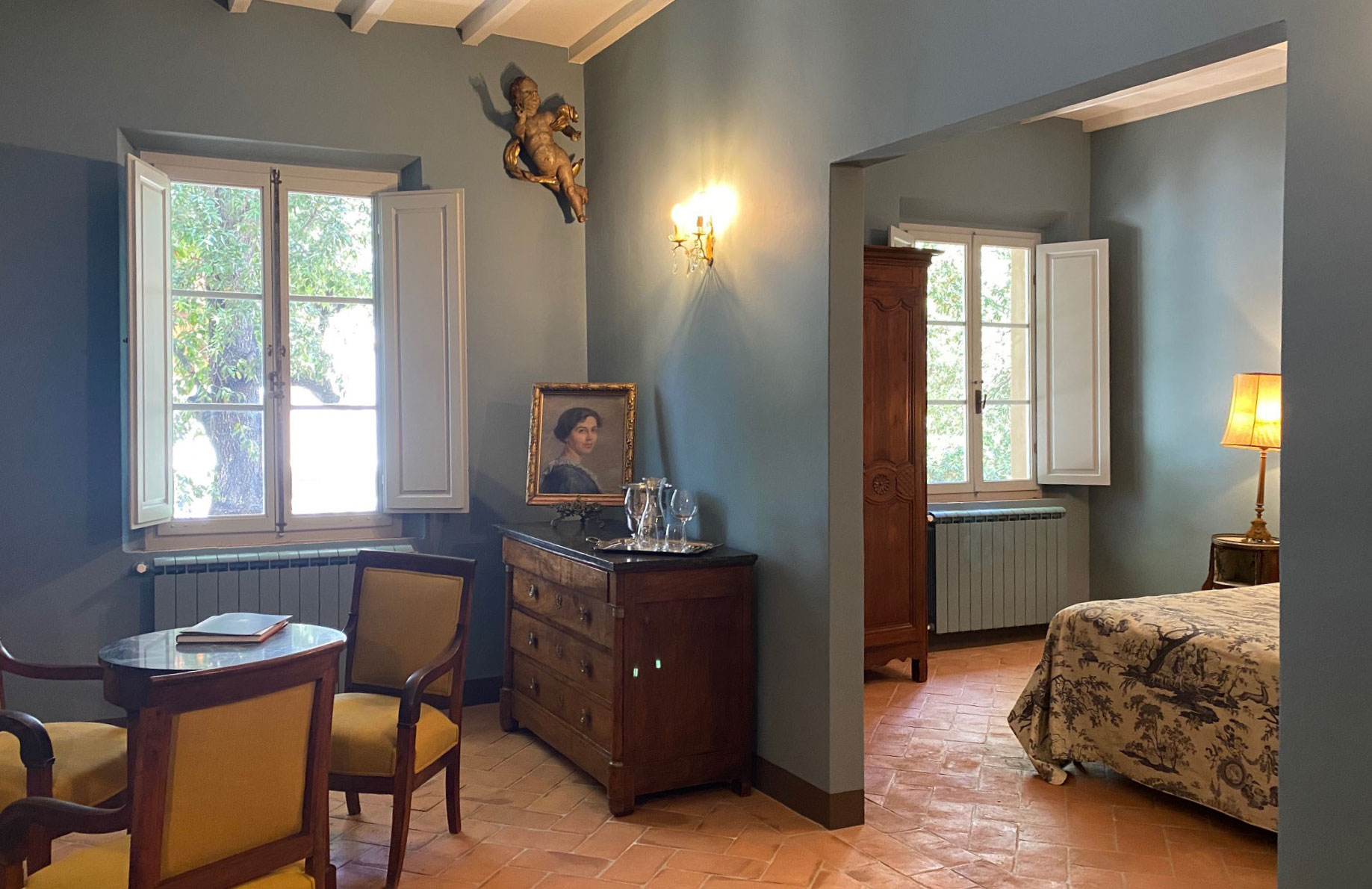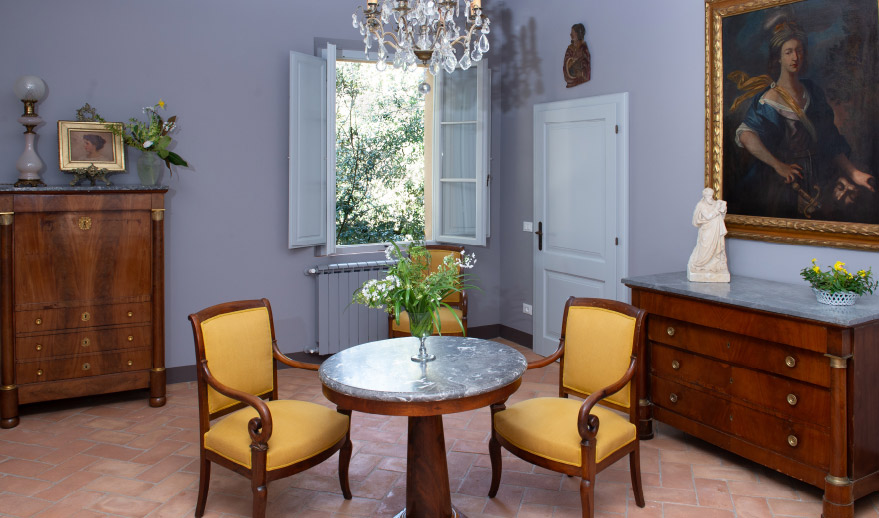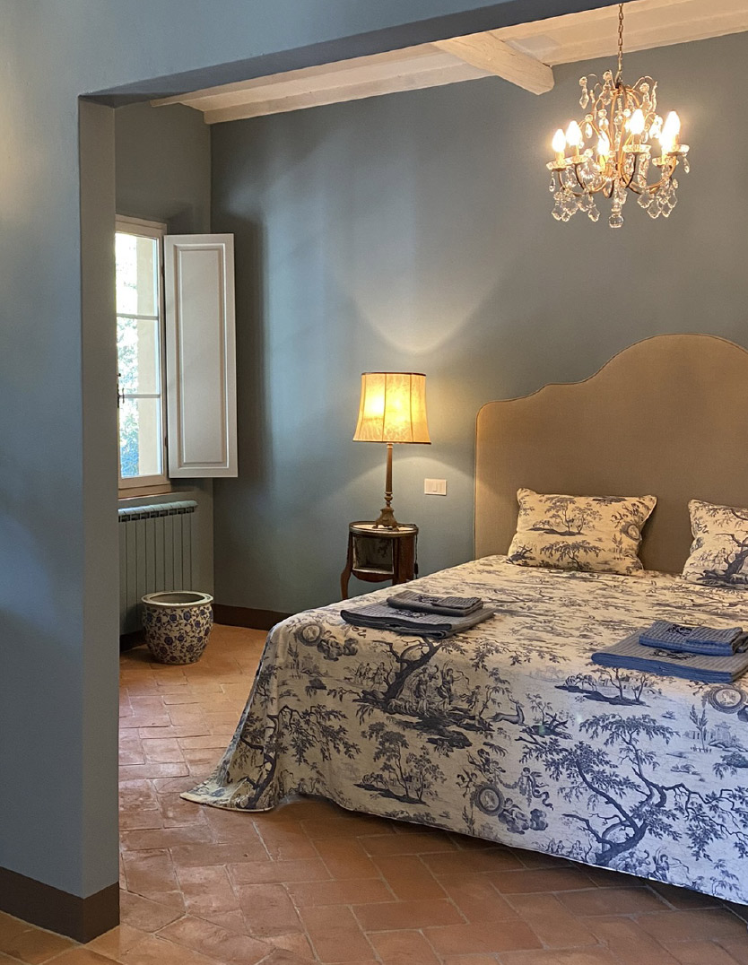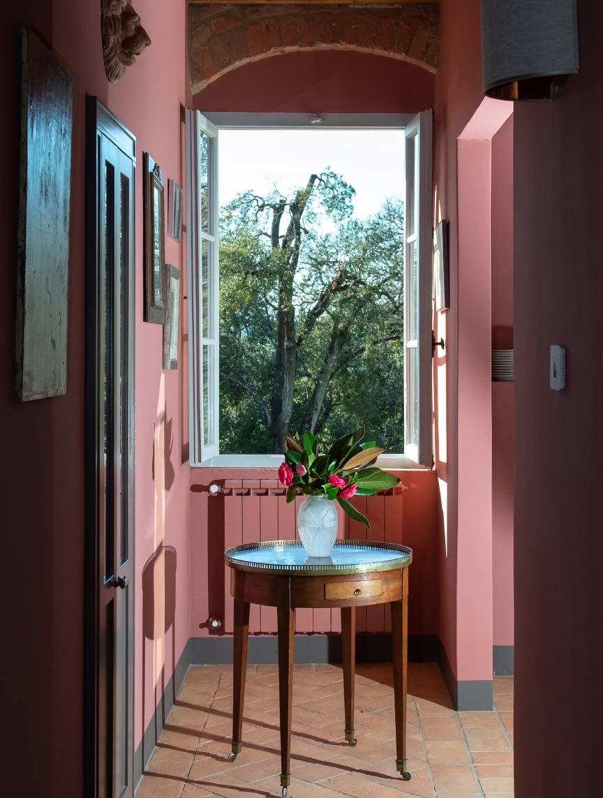 Un casale toscano trasformato in agriturismo grazie a un attento progetto di recupero, che ha valorizzato l’edificio storico integrandovi molteplici opere d’arte come dipinti, sculture e mobili d’antiquariato.